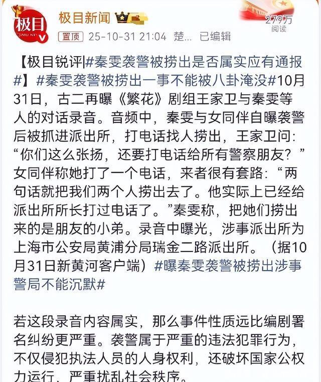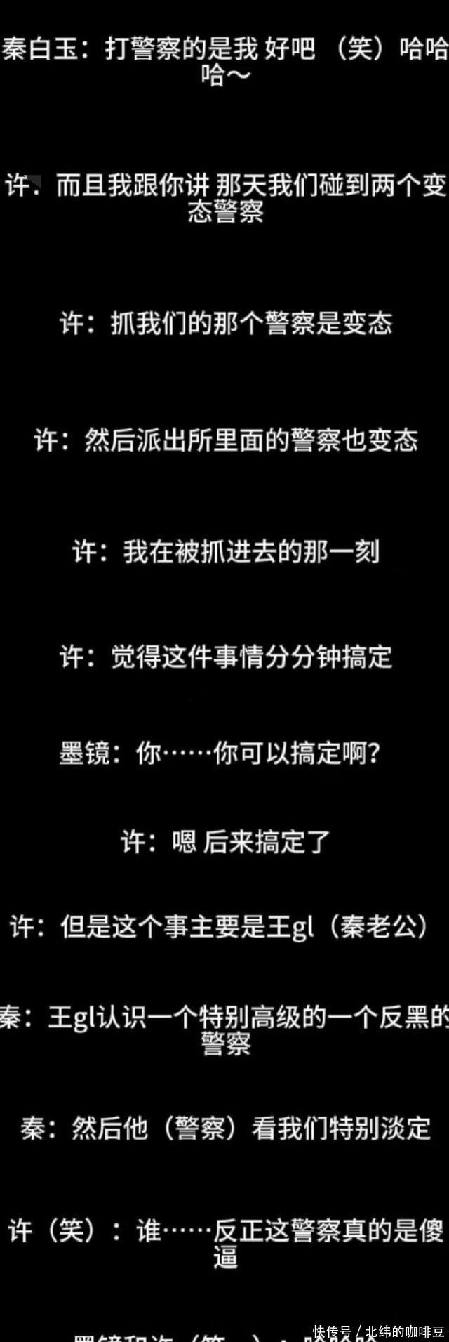 那如果说以上这些不算什么,有些人可能只是觉得王家卫嘴碎了一些,背后说人坏话,顶多算个品德问题,那么下面可就来重头戏了。 在曝出的录音里呢,还有另一件事情,说是目无王法可能都不为过! 编剧秦雯说自己曾经袭警,一点都不怕,意思像是打个电话就大摇大摆从派出所出来了,出来仍对警察出言不逊。 很明显,这已经不是普通的行业潜规则,而是赤裸裸地炫耀特权,挑战法律的公正。